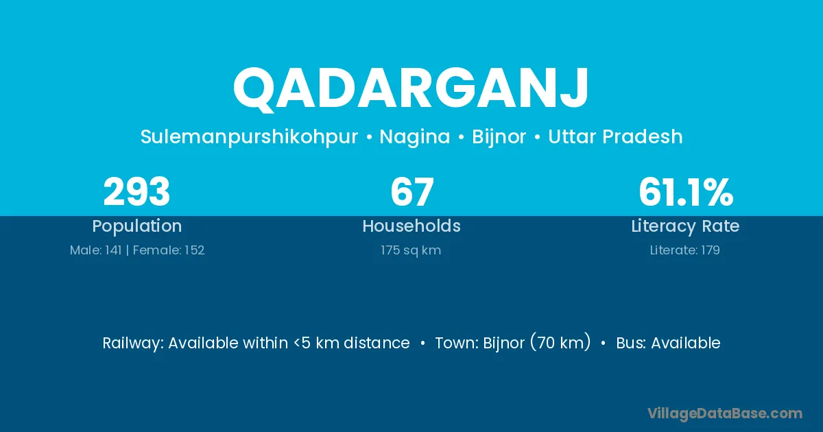 Bijnor (70 km) is the nearest town to Qadarganj village for major economic activities and is located approximately 70 km away.