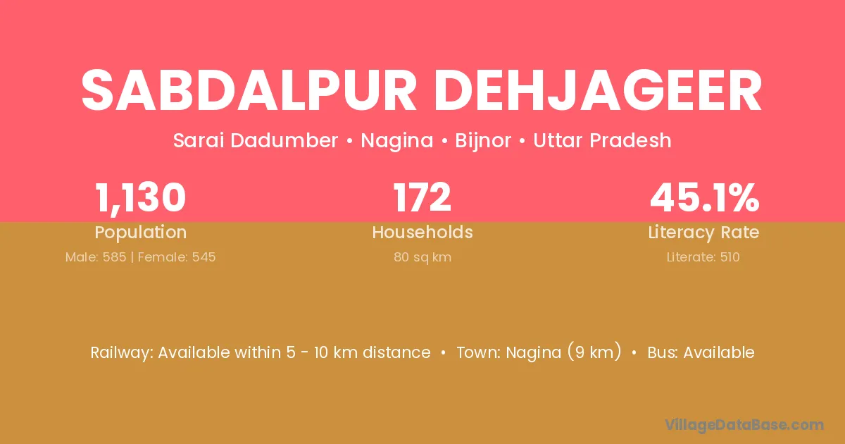 Nagina (9 km) is the nearest town to Sabdalpur Dehjageer village for major economic activities and is located approximately 9 km away.