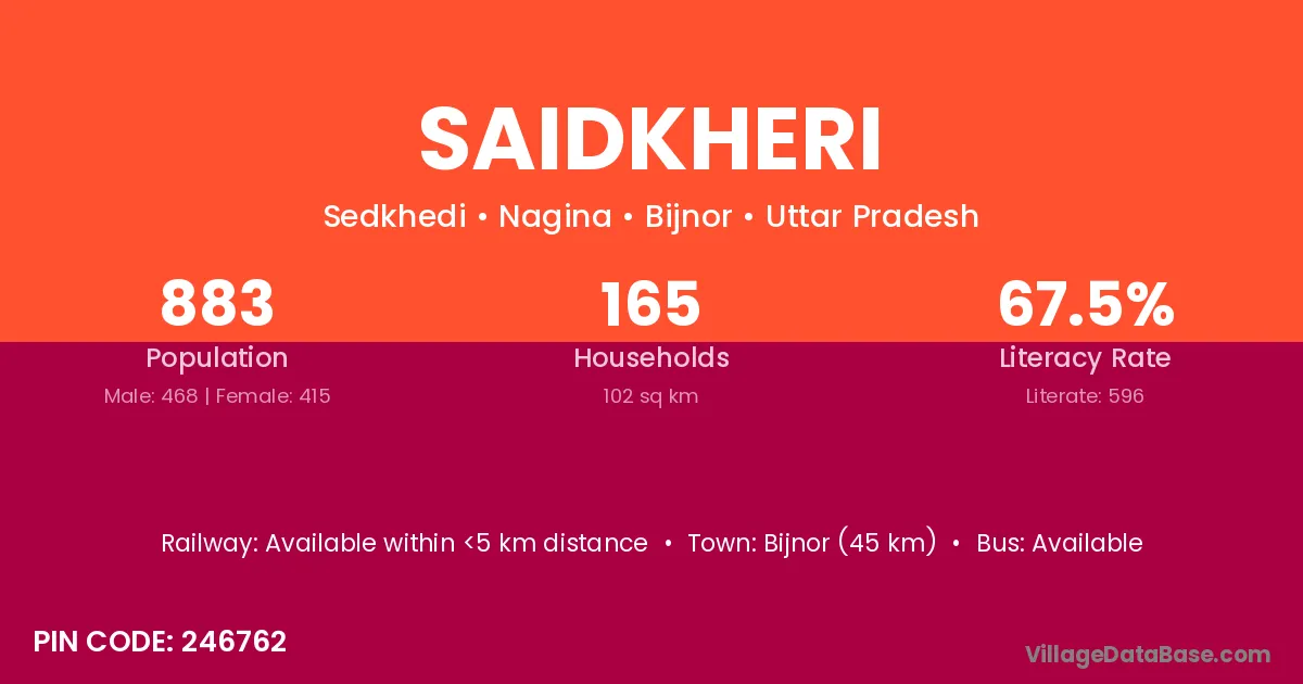Bijnor (45 km) is the nearest town to Saidkheri village for major economic activities and is located approximately 45 km away.