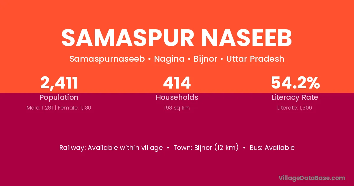 Bijnor (12 km) is the nearest town to Samaspur Naseeb village for major economic activities and is located approximately 12 km away.