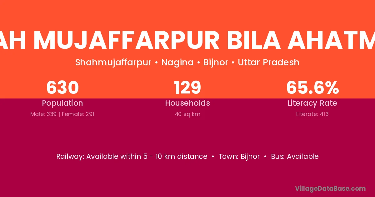 Shah Mujaffarpur Bila Ahatmali village has a total population of 630 people, of which 339 are males and 291 are females.