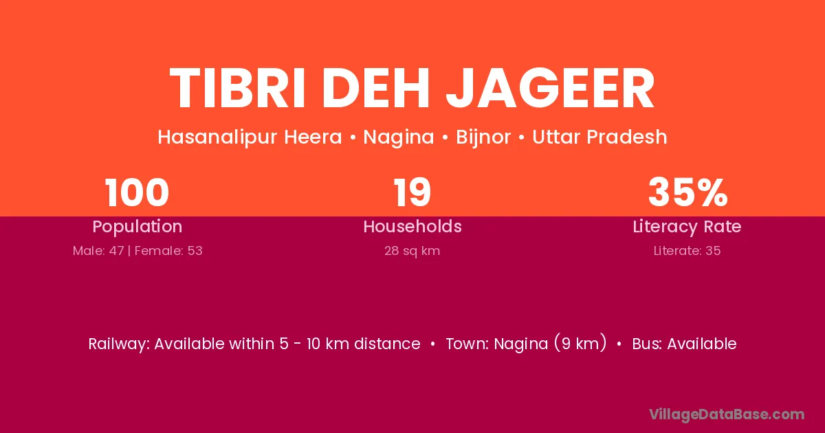 Nagina (9 km) is the nearest town to Tibri Deh Jageer village for major economic activities and is located approximately 9 km away.