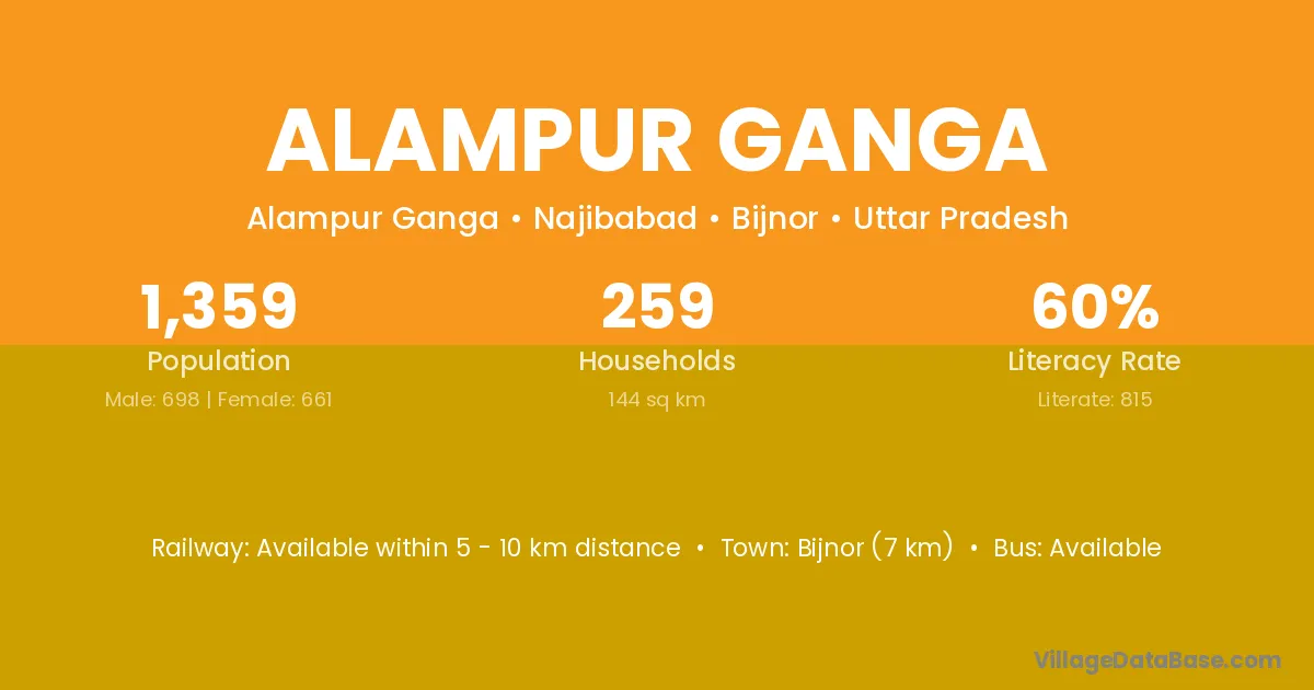 Bijnor (7 km) is the nearest town to Alampur Ganga village for major economic activities and is located approximately 7 km away.