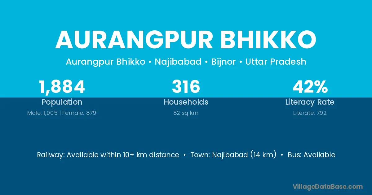 Najibabad (14 km) is the nearest town to Aurangpur Bhikko village for major economic activities and is located approximately 14 km away.