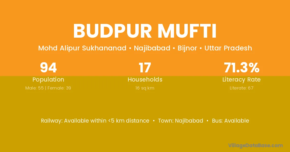 Budpur Mufti village has a total population of 94 people, of which 55 are males and 39 are females.