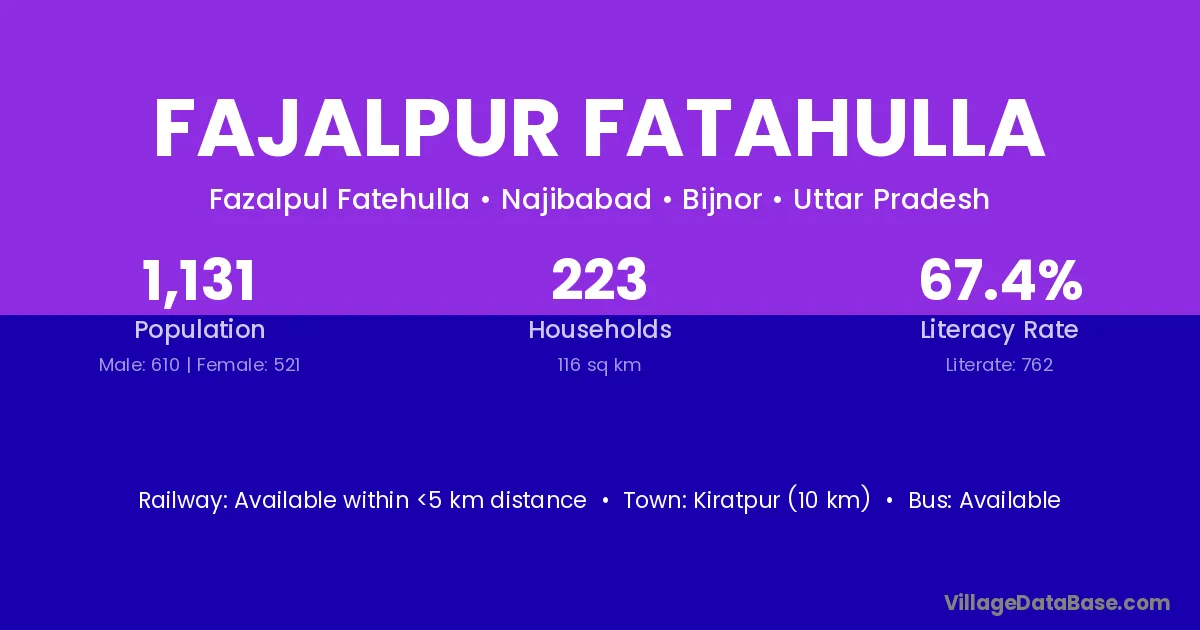 Fajalpur Fatahulla village has a total population of 1,131 people, of which 610 are males and 521 are females.