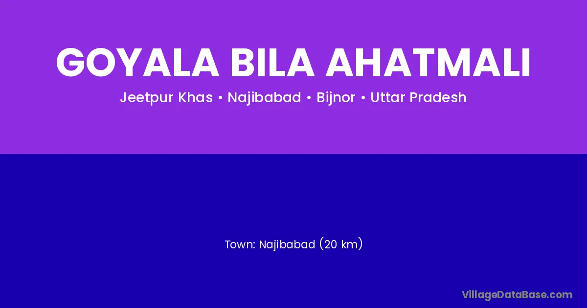 Najibabad (20 km) is the nearest town to Goyala Bila Ahatmali village for major economic activities and is located approximately 20 km away.