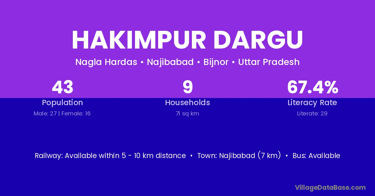 Najibabad (7 km) is the nearest town to Hakimpur Dargu village for major economic activities and is located approximately 7 km away.