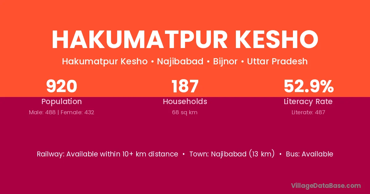 Najibabad (13 km) is the nearest town to Hakumatpur Kesho village for major economic activities and is located approximately 13 km away.