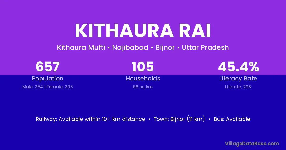 Bijnor (11 km) is the nearest town to Kithaura Rai village for major economic activities and is located approximately 11 km away.