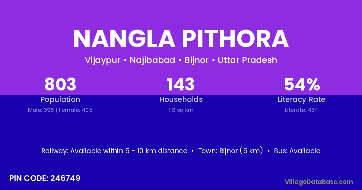 Bijnor (5 km) is the nearest town to Nangla Pithora village for major economic activities and is located approximately 5 km away.