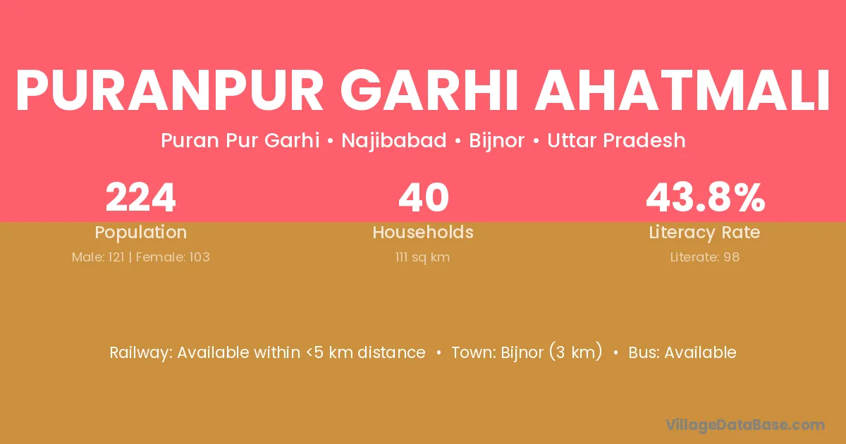 Bijnor (3 km) is the nearest town to Puranpur Garhi Ahatmali village for major economic activities and is located approximately 3 km away.