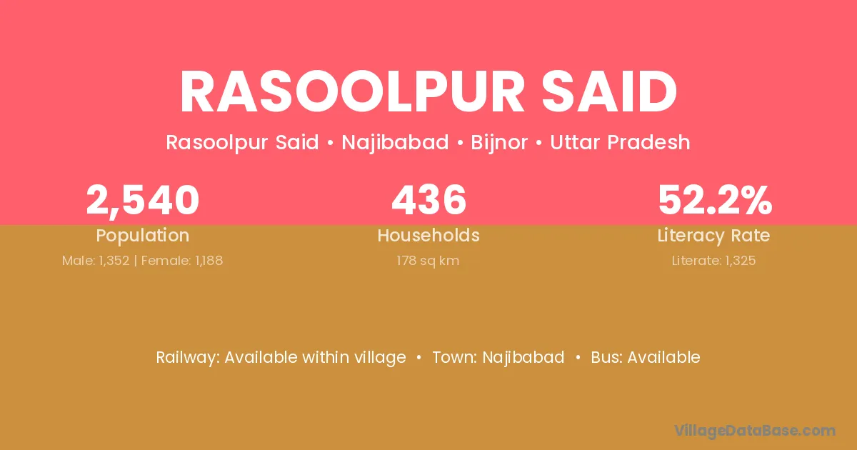 Najibabad is the nearest town to Rasoolpur Said village for major economic activities