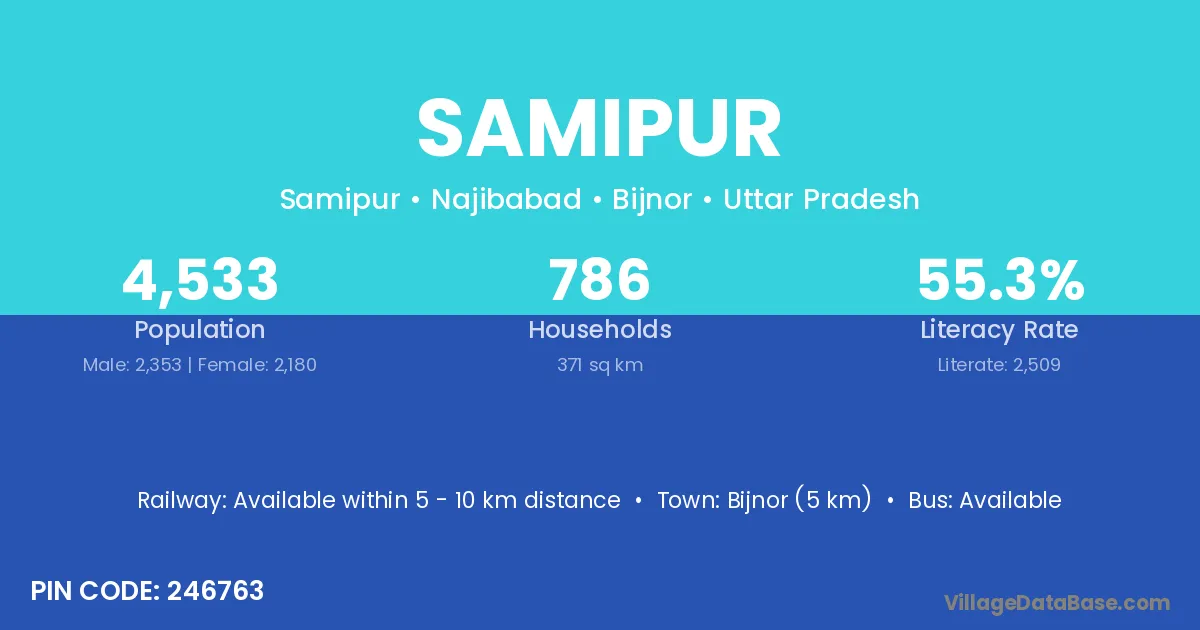 Bijnor (5 km) is the nearest town to Samipur village for major economic activities and is located approximately 5 km away.