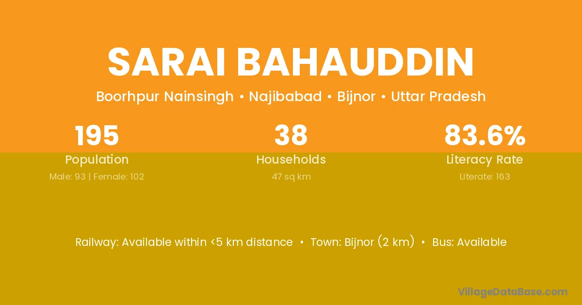 Bijnor (2 km) is the nearest town to Sarai Bahauddin village for major economic activities and is located approximately 2 km away.