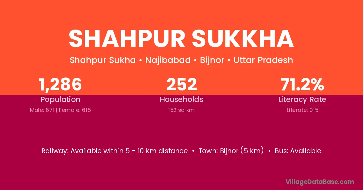 Bijnor (5 km) is the nearest town to Shahpur Sukkha village for major economic activities and is located approximately 5 km away.