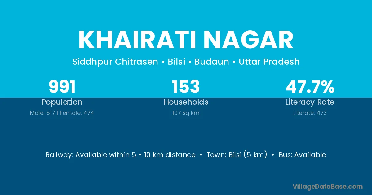Bilsi (5 km) is the nearest town to Khairati Nagar village for major economic activities and is located approximately 5 km away.