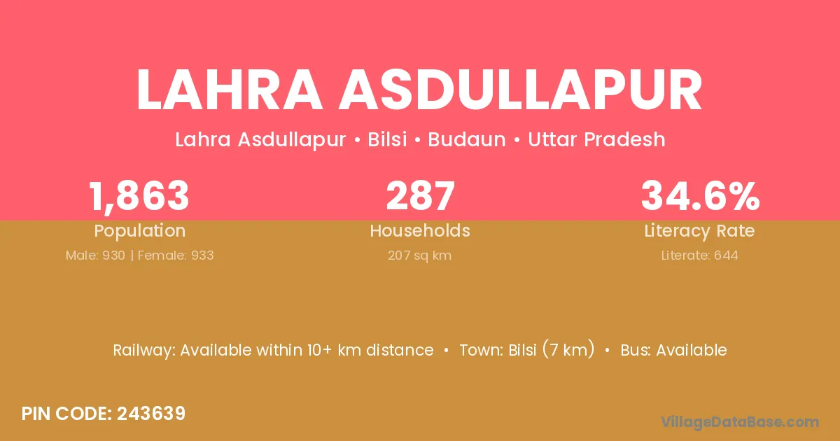Bilsi (7 km) is the nearest town to Lahra Asdullapur village for major economic activities and is located approximately 7 km away.