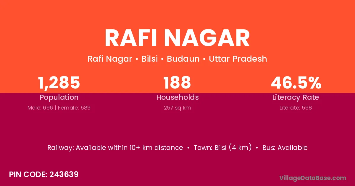 Bilsi (4 km) is the nearest town to Rafi Nagar village for major economic activities and is located approximately 4 km away.