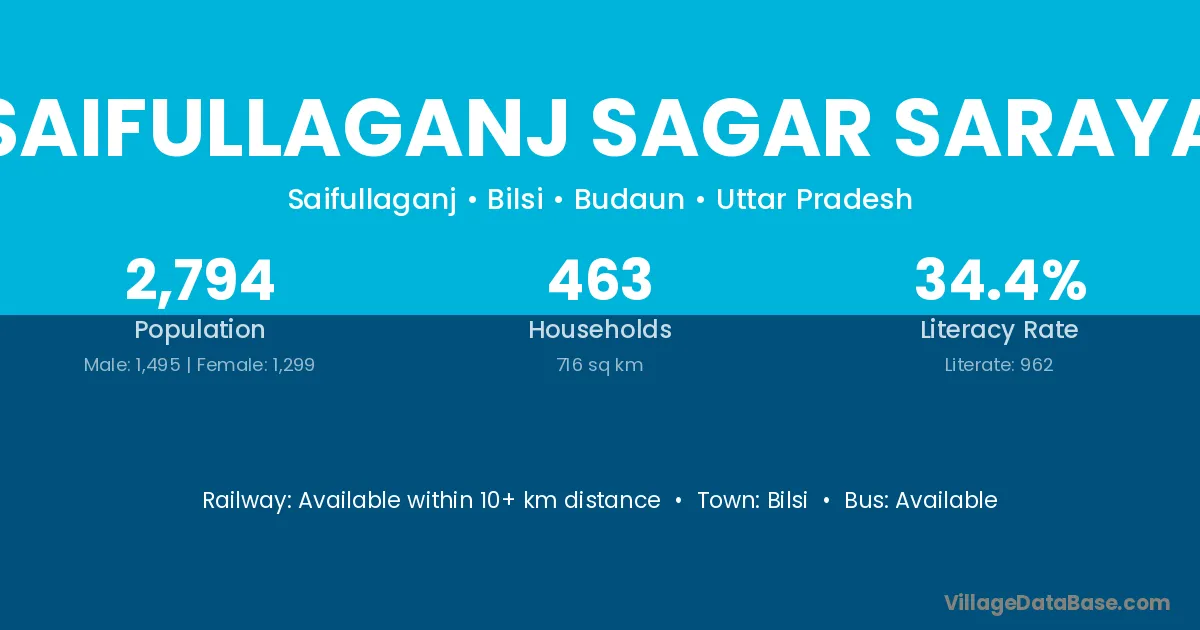 Saifullaganj Sagar Saraya village has a total population of 2,794 people, of which 1,495 are males and 1,299 are females.