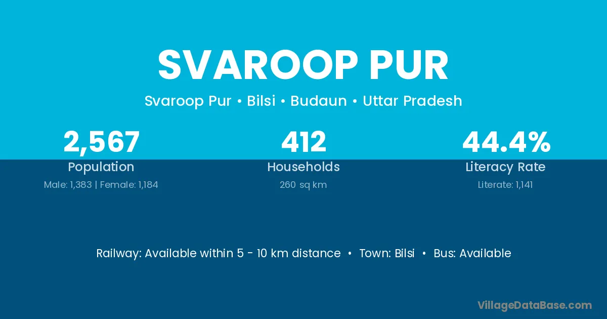 Svaroop Pur village has a total population of 2,567 people, of which 1,383 are males and 1,184 are females.