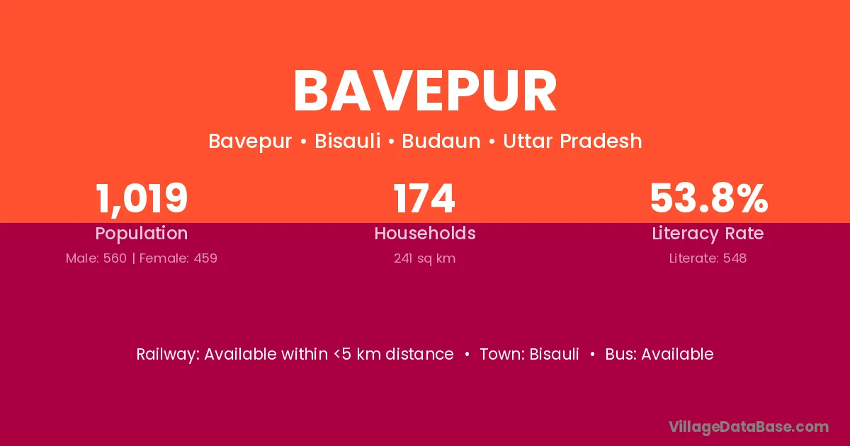 Bavepur village has a total population of 1,019 people, of which 560 are males and 459 are females.