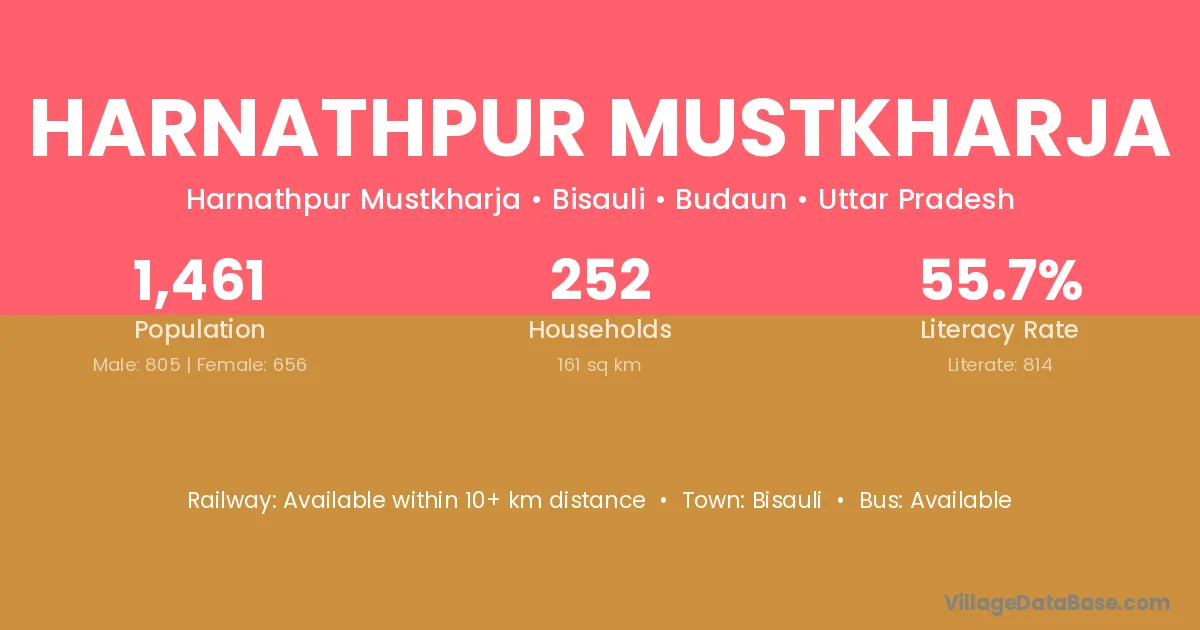 Harnathpur Mustkharja village has a total population of 1,461 people, of which 805 are males and 656 are females.