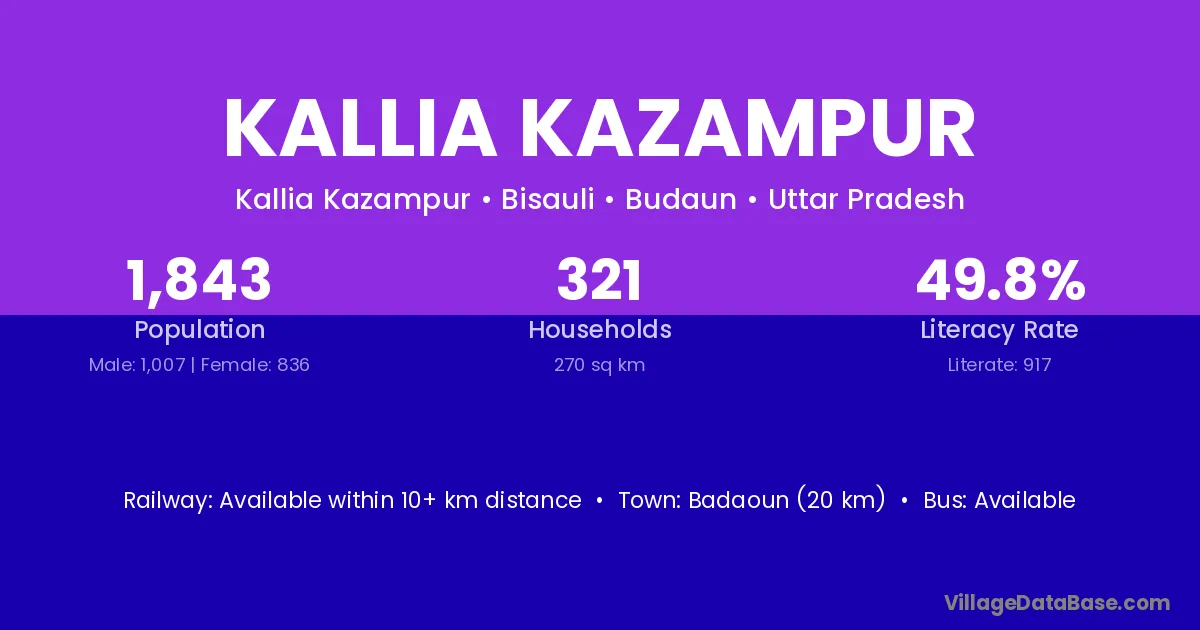 Badaoun (20 km) is the nearest town to Kallia Kazampur village for major economic activities and is located approximately 20 km away.