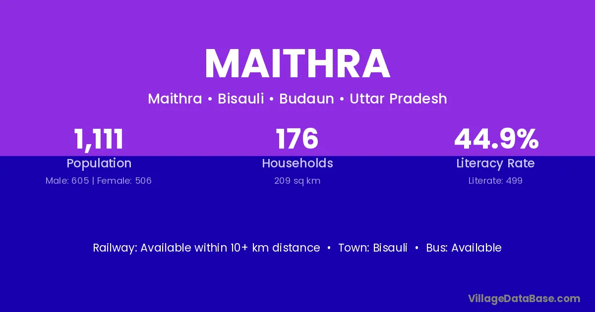 Maithra village has a total population of 1,111 people, of which 605 are males and 506 are females.