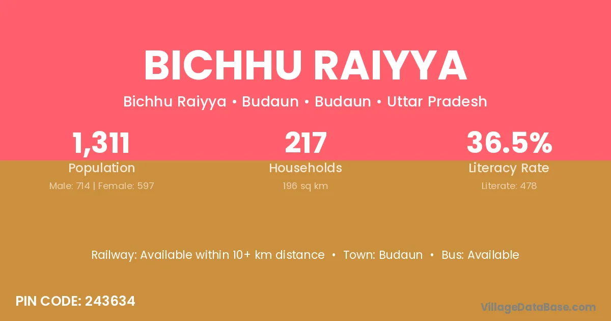 Budaun is the nearest town to Bichhu Raiyya village for major economic activities