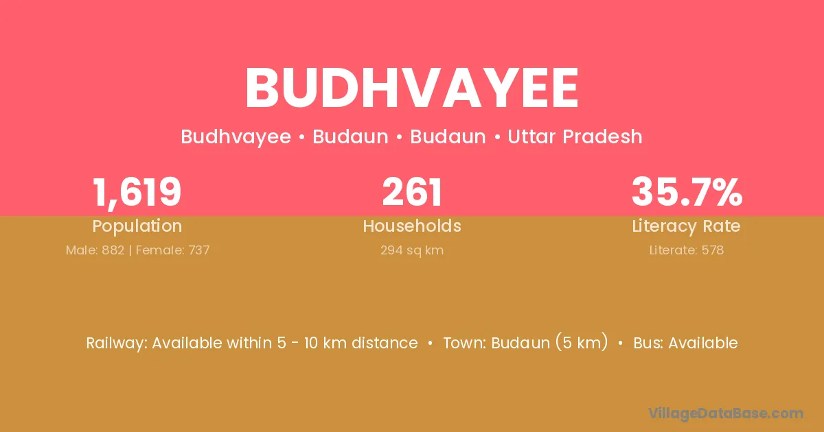 Budaun (5 km) is the nearest town to Budhvayee village for major economic activities and is located approximately 5 km away.