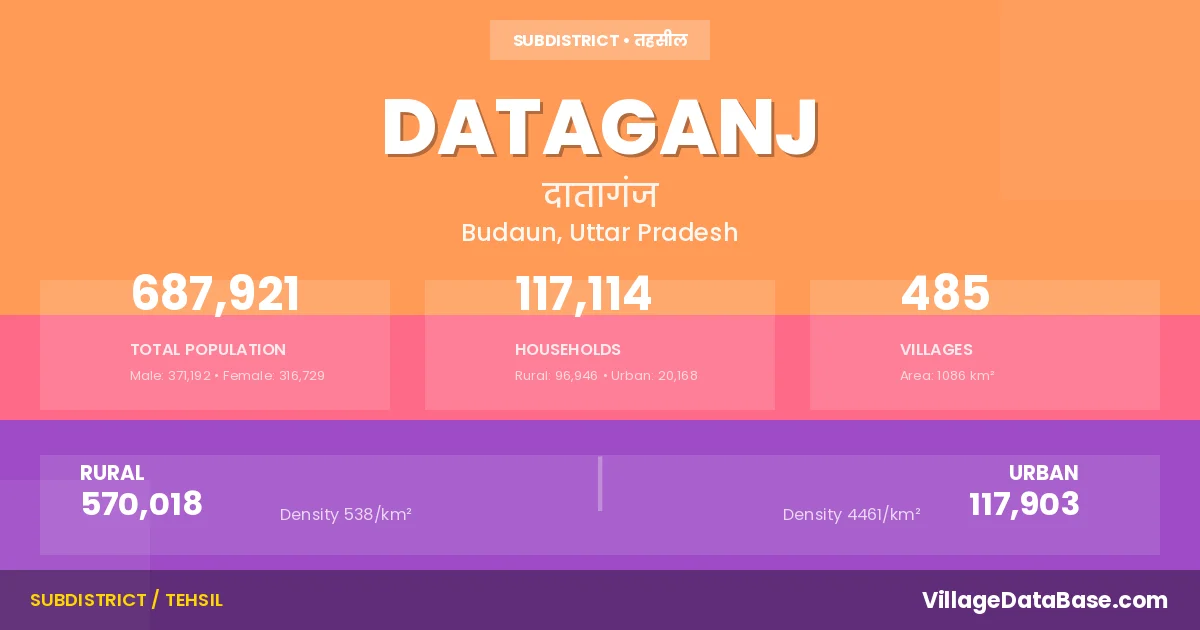 According to the 2011 census The total area of Dataganj Tehsil is 1086 km², with a population of 687921 people. The population density is 634 inhabitants per square kilometre, and there are approximately 117114 houses in the sub district.