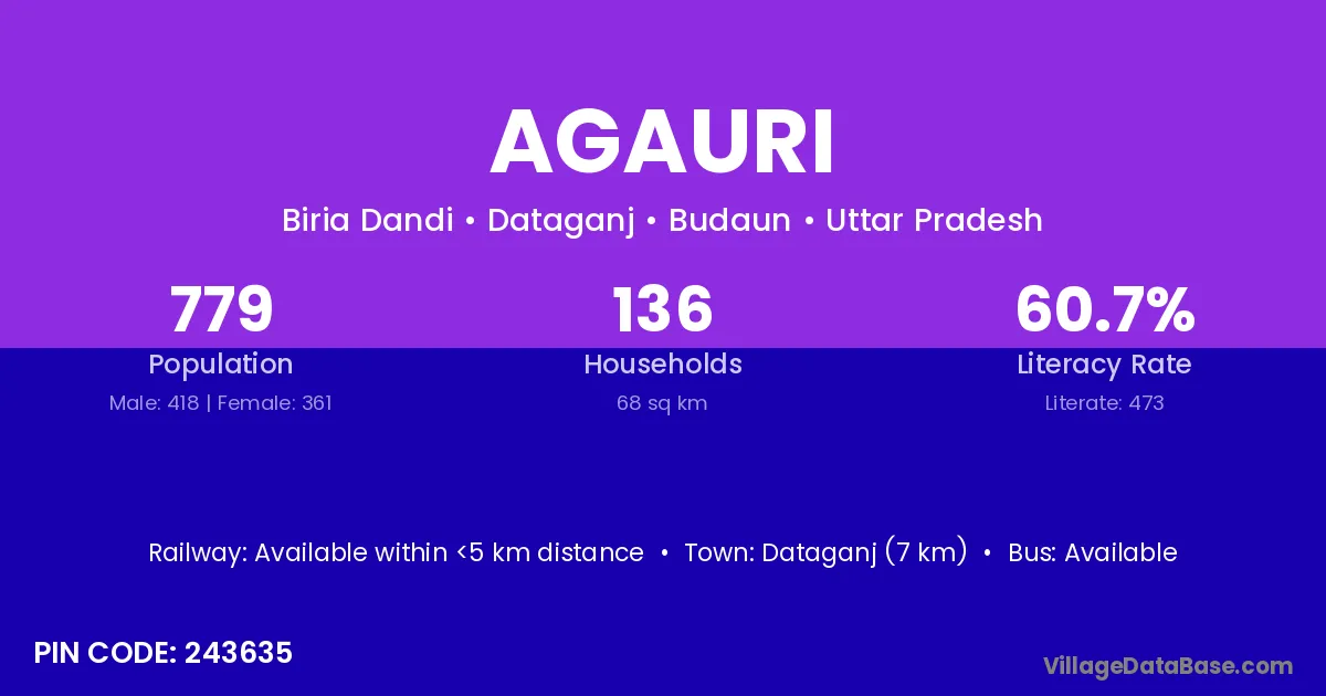 Dataganj (7 km) is the nearest town to Agauri village for major economic activities and is located approximately 7 km away.
