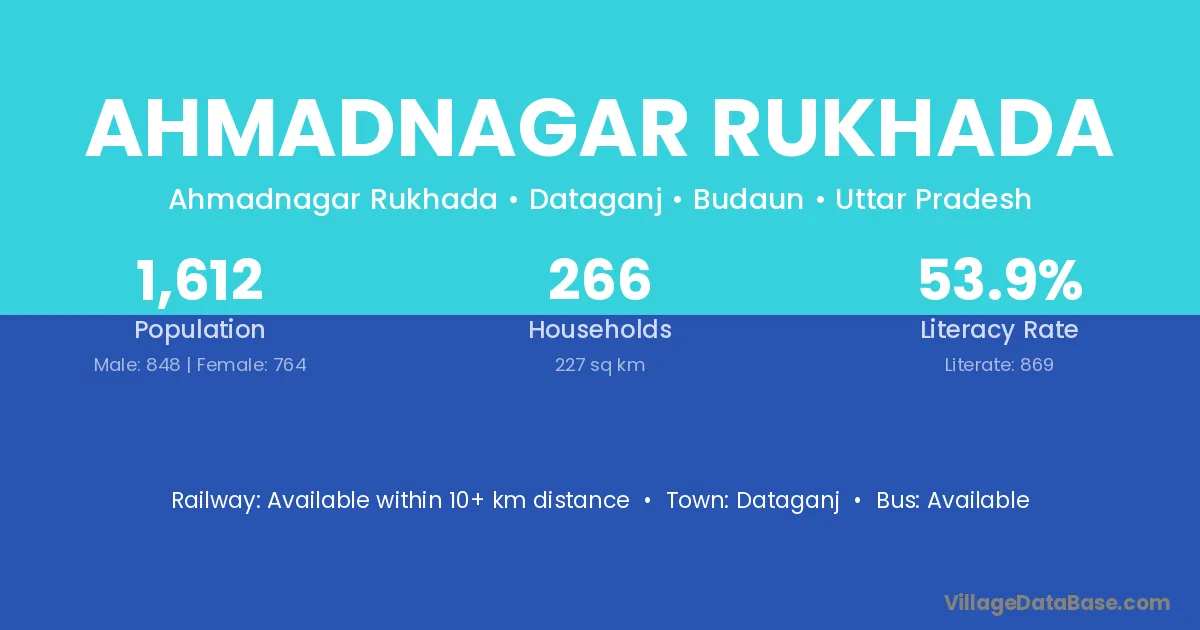 Ahmadnagar Rukhada village has a total population of 1,612 people, of which 848 are males and 764 are females.