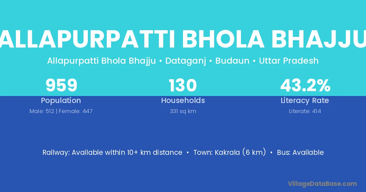 Allapurpatti Bhola Bhajju village has a total population of 959 people, of which 512 are males and 447 are females.