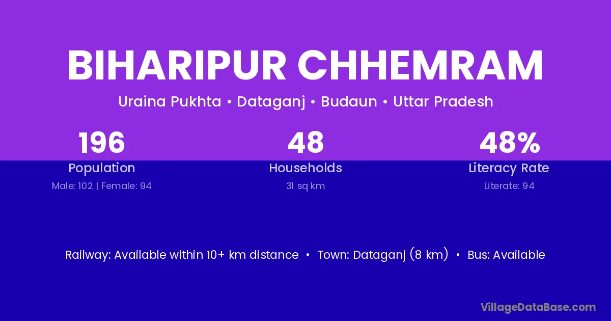 Biharipur Chhemram village has a total population of 196 people, of which 102 are males and 94 are females.