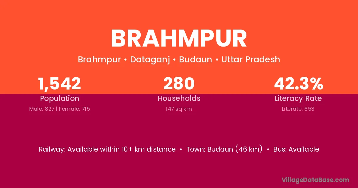 Budaun (46 km) is the nearest town to Brahmpur village for major economic activities and is located approximately 46 km away.