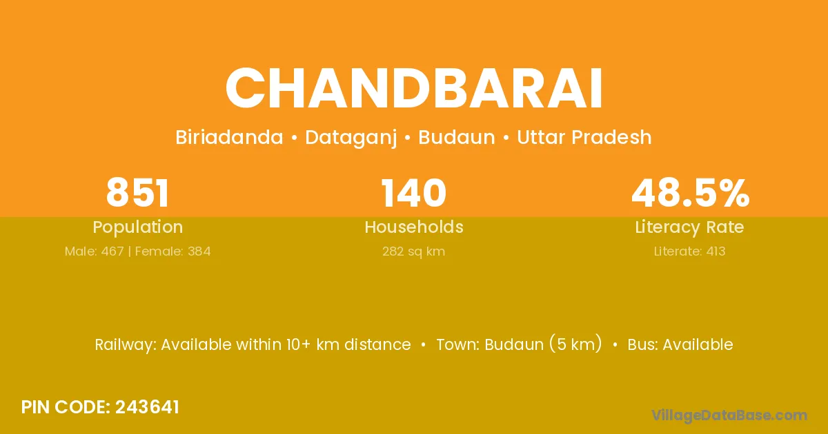 Budaun (5 km) is the nearest town to Chandbarai village for major economic activities and is located approximately 5 km away.