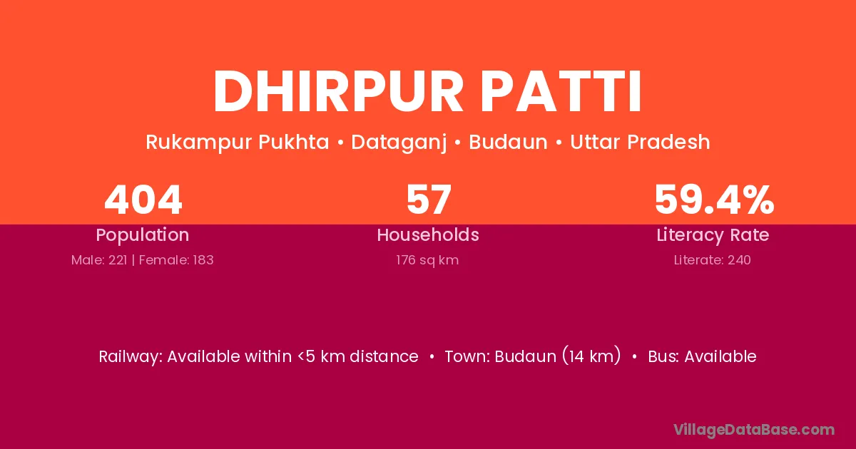 Budaun (14 km) is the nearest town to Dhirpur Patti village for major economic activities and is located approximately 14 km away.