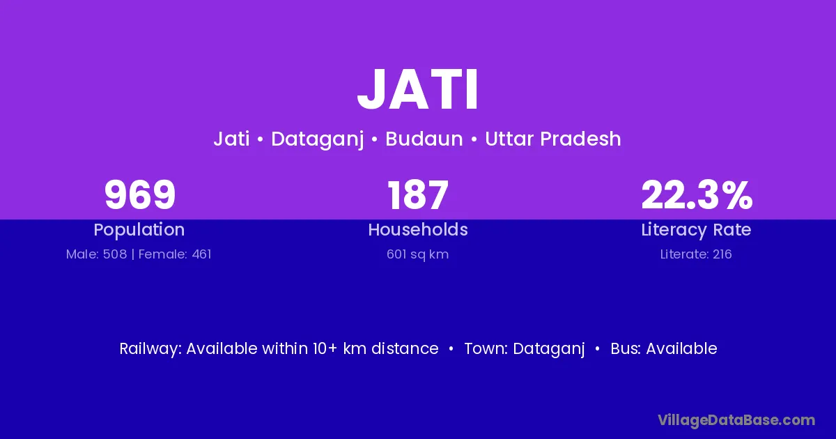 Jati village has a total population of 969 people, of which 508 are males and 461 are females.