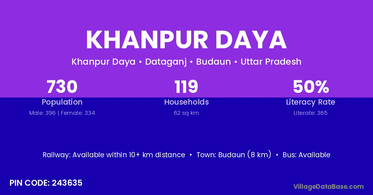 Budaun (8 km) is the nearest town to Khanpur Daya village for major economic activities and is located approximately 8 km away.