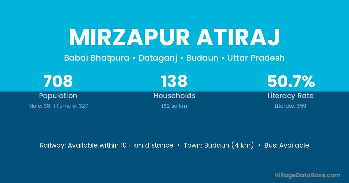 Budaun (4 km) is the nearest town to Mirzapur Atiraj village for major economic activities and is located approximately 4 km away.