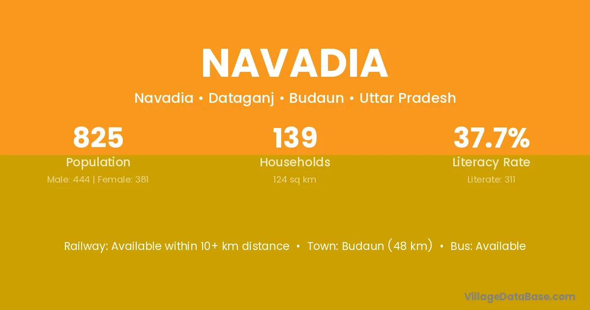 Budaun (48 km) is the nearest town to Navadia village for major economic activities and is located approximately 48 km away.