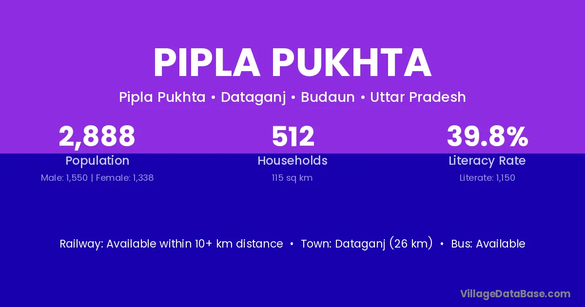 Dataganj (26 km) is the nearest town to Pipla Pukhta village for major economic activities and is located approximately 26 km away.