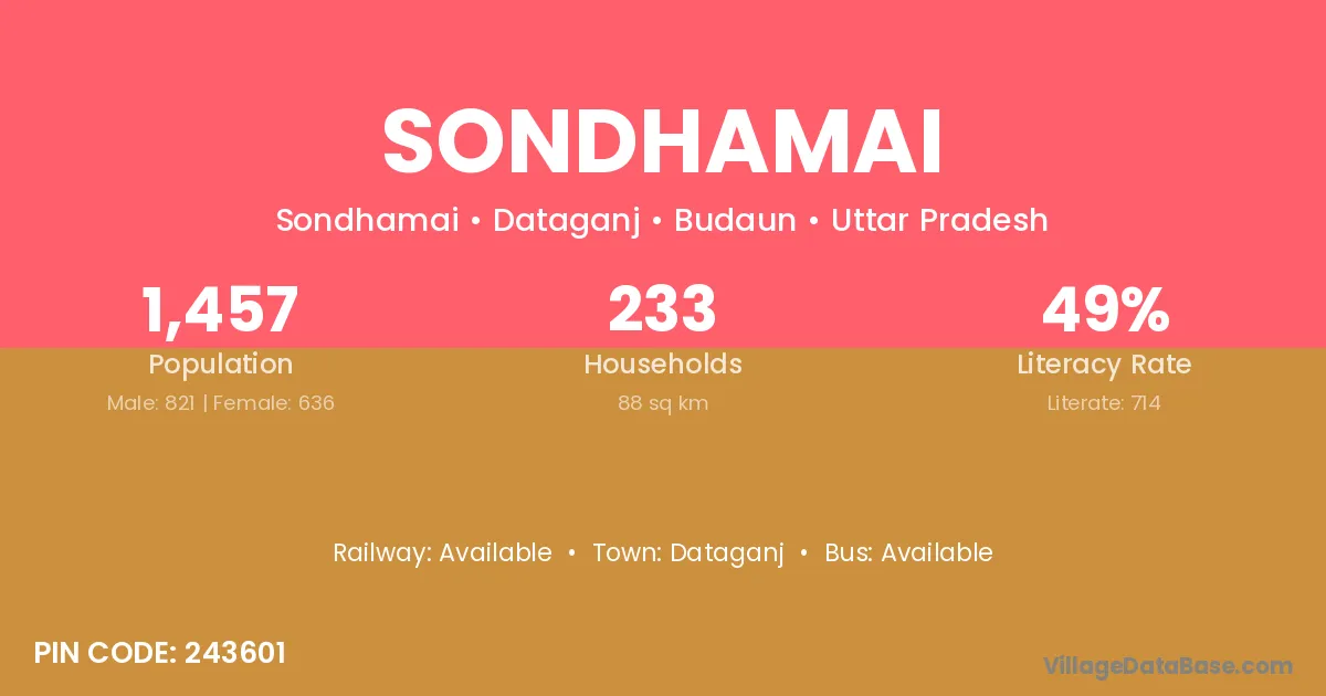 Sondhamai village has a total population of 1,457 people, of which 821 are males and 636 are females.