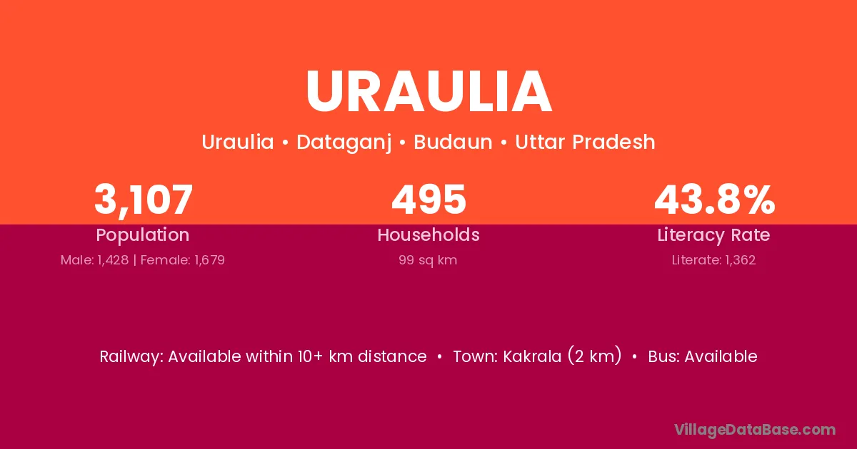 Uraulia village has a total population of 3,107 people, of which 1,428 are males and 1,679 are females.