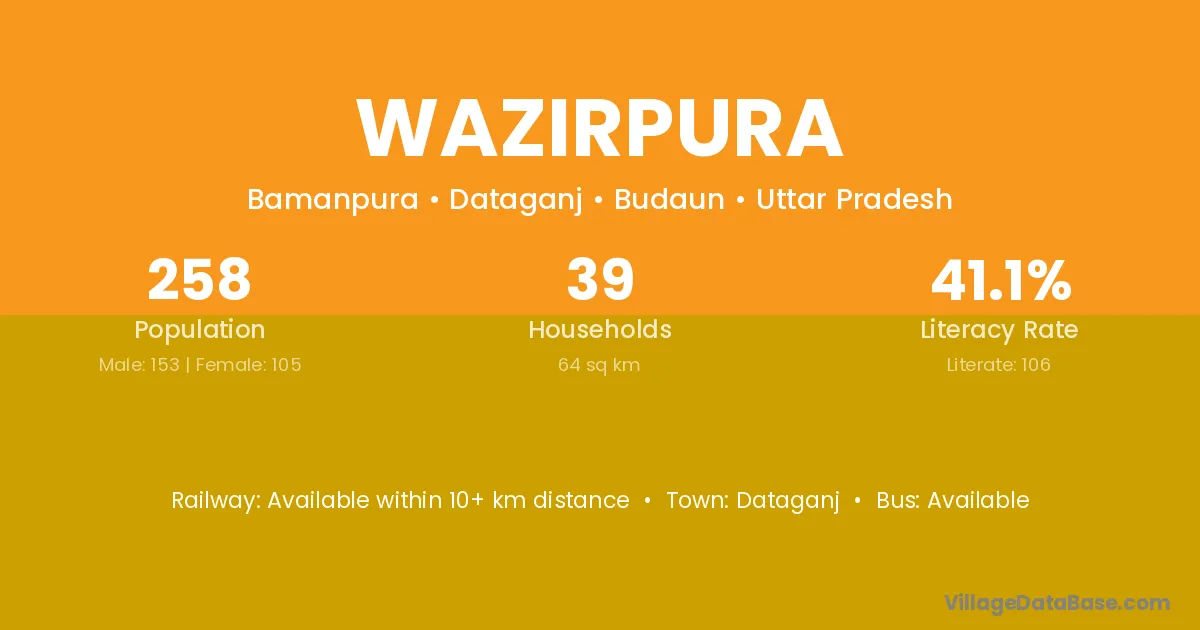Wazirpura village has a total population of 258 people, of which 153 are males and 105 are females.