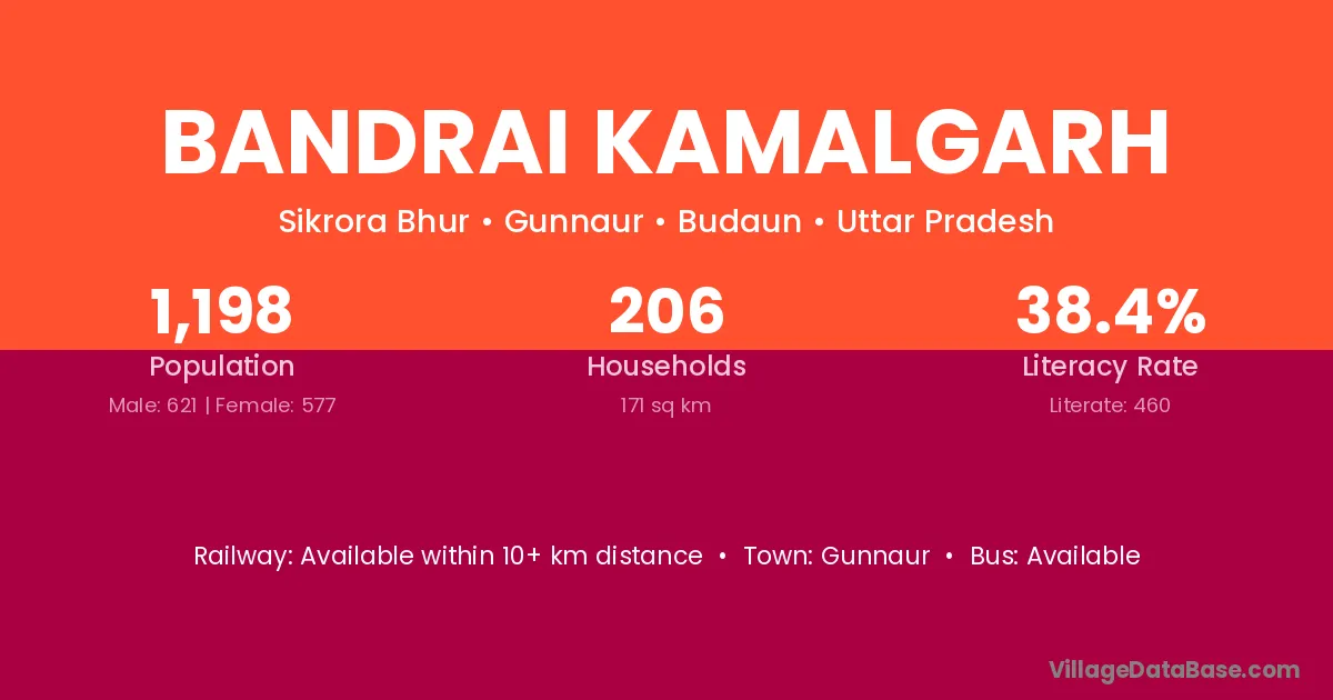 Bandrai Kamalgarh village has a total population of 1,198 people, of which 621 are males and 577 are females.
