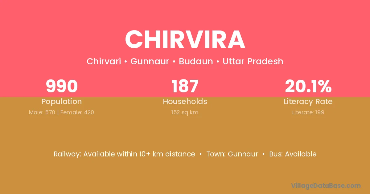 Chirvira village has a total population of 990 people, of which 570 are males and 420 are females.