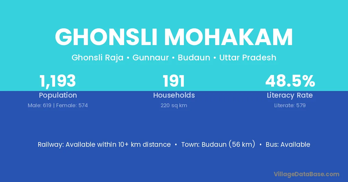 Budaun (56 km) is the nearest town to Ghonsli Mohakam village for major economic activities and is located approximately 56 km away.